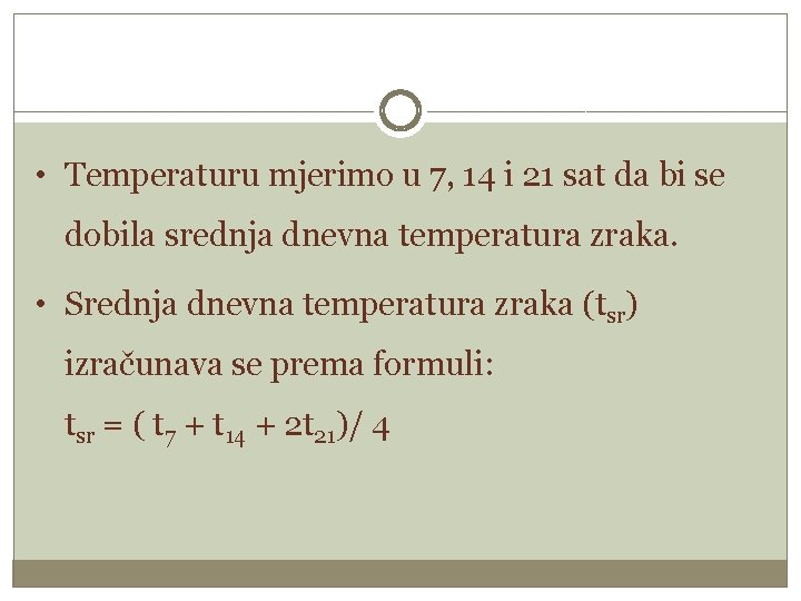 • Temperaturu mjerimo u 7, 14 i 21 sat da bi se dobila srednja dnevna temperatura zraka. • Srednja dnevna temperatura zraka (tsr) izračunava se prema formuli: tsr = ( t 7 + t 14 + 2 t 21)/ 4