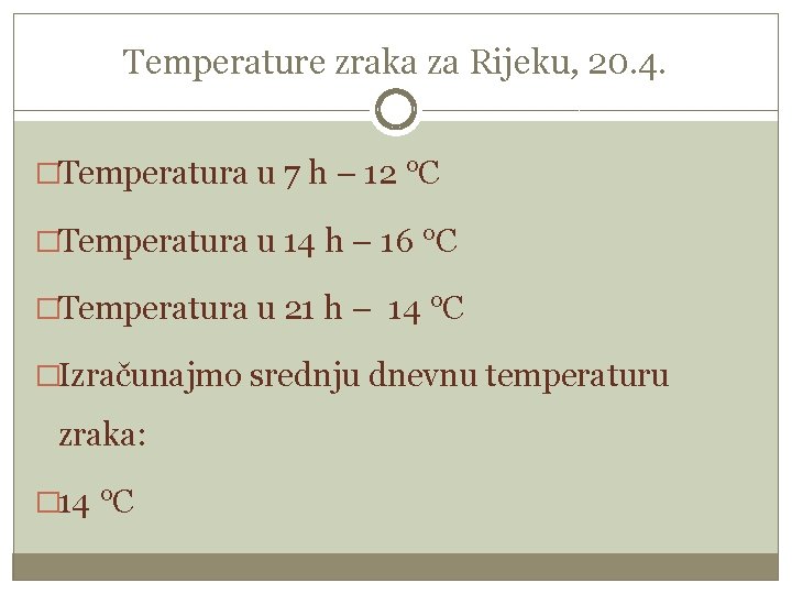 Temperature zraka za Rijeku, 20. 4. �Temperatura u 7 h – 12 °C �Temperatura u 14 h – 16 °C �Temperatura u 21 h – 14 °C �Izračunajmo srednju dnevnu temperaturu zraka: � 14 °C