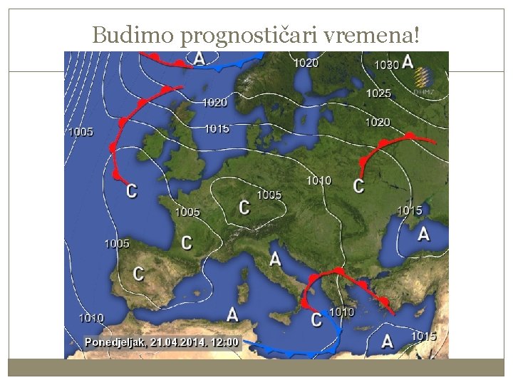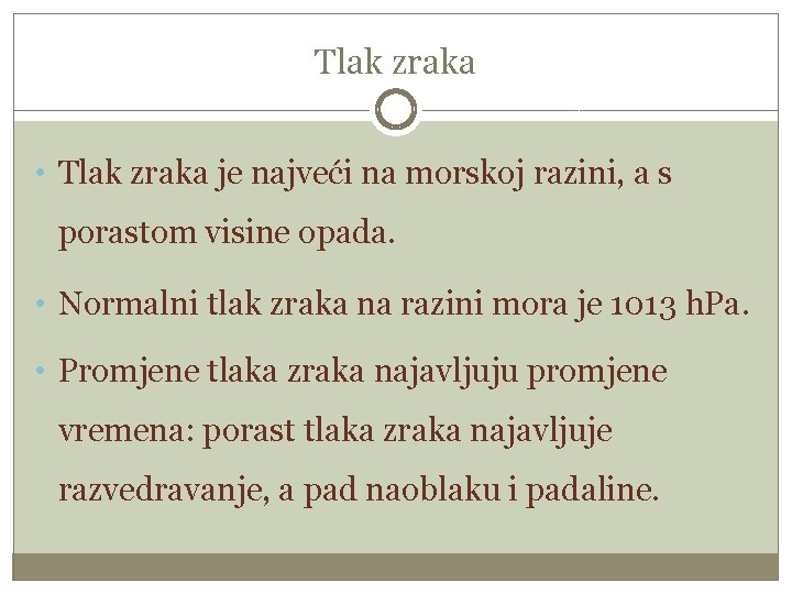 Tlak zraka • Tlak zraka je najveći na morskoj razini, a s porastom visine opada. • Normalni tlak zraka na razini mora je 1013 h. Pa. • Promjene tlaka zraka najavljuju promjene vremena: porast tlaka zraka najavljuje razvedravanje, a pad naoblaku i padaline.