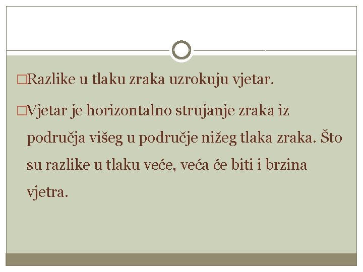 �Razlike u tlaku zraka uzrokuju vjetar. �Vjetar je horizontalno strujanje zraka iz područja višeg u područje nižeg tlaka zraka. Što su razlike u tlaku veće, veća će biti i brzina vjetra.