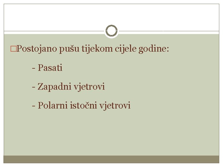 �Postojano pušu tijekom cijele godine: - Pasati - Zapadni vjetrovi - Polarni istočni vjetrovi