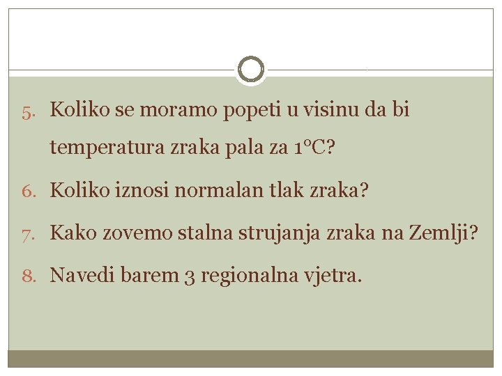5. Koliko se moramo popeti u visinu da bi temperatura zraka pala za 1°C? 6. Koliko iznosi normalan tlak zraka? 7. Kako zovemo stalna strujanja zraka na Zemlji? 8. Navedi barem 3 regionalna vjetra.