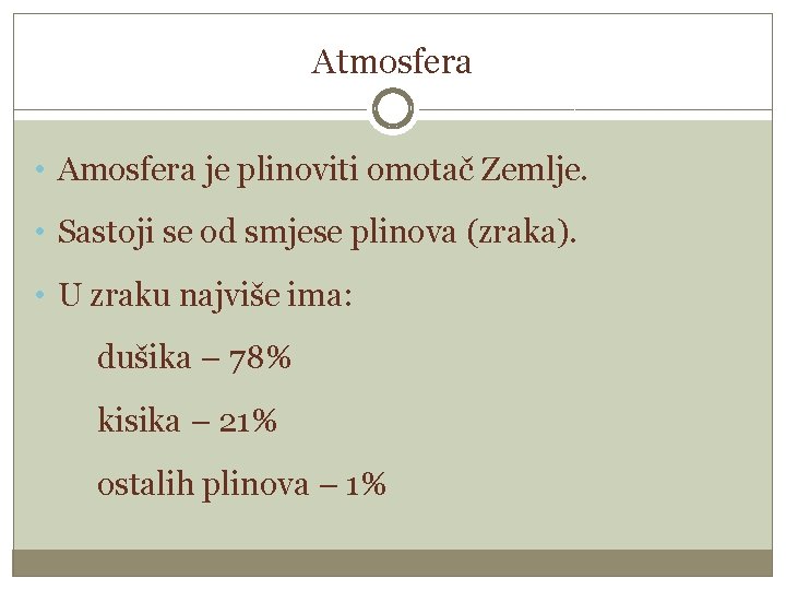 Atmosfera • Amosfera je plinoviti omotač Zemlje. • Sastoji se od smjese plinova (zraka). • U zraku najviše ima: dušika – 78% kisika – 21% ostalih plinova – 1%