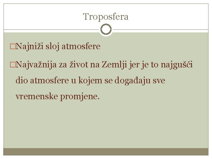 Troposfera �Najniži sloj atmosfere �Najvažnija za život na Zemlji jer je to najgušći dio atmosfere u kojem se događaju sve vremenske promjene.