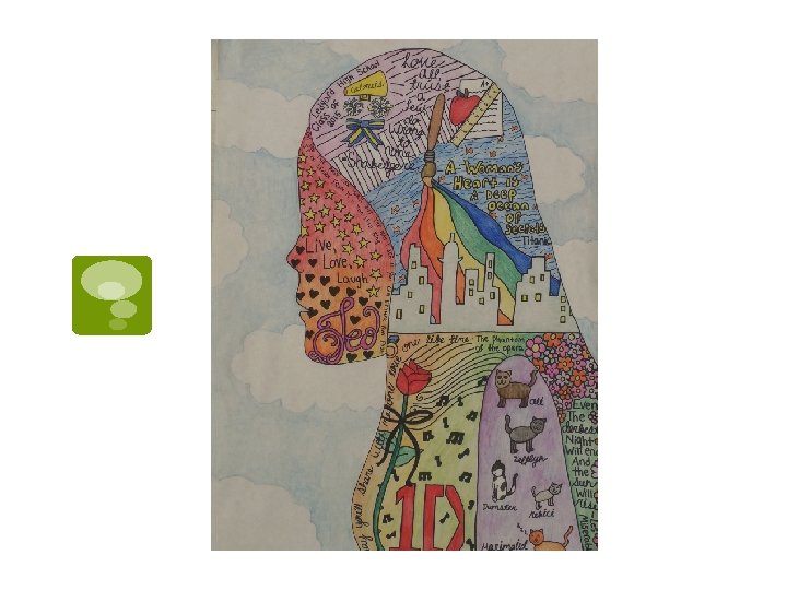 Set-Up § You will create a self portrait that represents various aspects of your identity in a VISUAL way through symbols, doodles, designs, patterns, metaphor, font/text etc. § We will begin by listing and brainstorming various aspects of our identity as well as how to show that in a visual manner. § Do this in your sketchbook. I want to spend a good chunk of time (about 30 to 45 minutes) on this. The more you have to work from, the better (you can always eliminate things, if needed). § I would list first, brainstorm symbolism second, sketch last. § You have 15+ years of experience that no one else in this room has or even in the world has. Try to think about what makes that experience unique. Then, think about how you can show it.