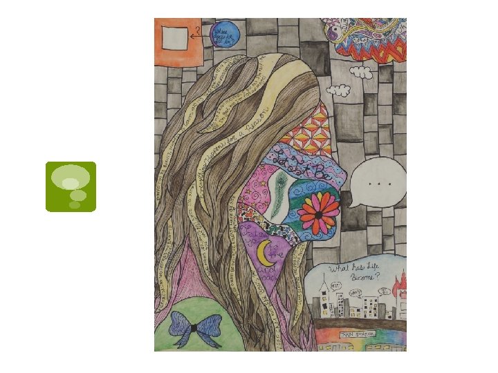 Process § Sketch out your designs carefully and lightly in pencil. You don’t have to color in things that will be black in pencil (maybe just make a little note to yourself to fill it in later). Pull as much as possible from your list. Fill in the white space! No “peas, ” please. Even large objects can be filled with textures and designs. § Some areas can be non-representational designs, but they should be purposeful and meaningful. § Don’t forget the background. Some students in the past have chosen to treat the background as their world that is outside themselves. § These can be stylized! In fact, they are more interesting if they are realistic, but a little more graphic/exaggerated. § When your pencil lines are set, trace over everything in Sharpie (I have three sizes). Make sure that the black areas are evenly distributed so that the composition flows. § Color can be established with watercolor pencil (we will probably do a little practice with this medium before adding it to our work).