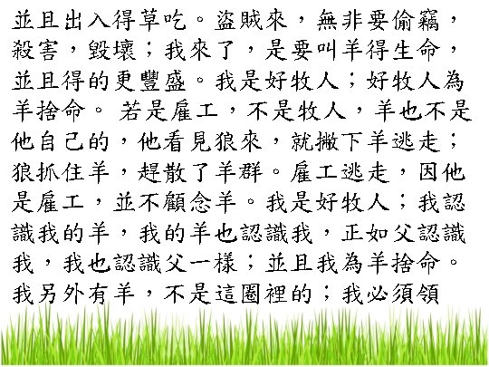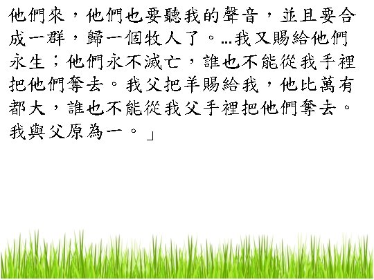 耶穌是怎樣的牧人 What kind of shepherd is Jesus? 8. 好牧者賜你永生 The Good Shepherd gives you eternal life 我又賜給他們永生;他們永不滅亡,誰也不能從 我手裏把他們奪去。我父把羊賜給我,他比萬有 都大,誰也不能從我父手裏把他們奪去。我與父 原為一。」 and I give eternal life to them, and they will never perish; and no one will snatch them out of My hand. My Father, who has given them to Me, is greater than all; and no one is able to snatch them out of the Father’s hand. I and the Father are one. ”