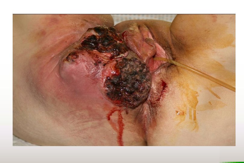 Zervixkarzinom - Therapiekomplikationen: Radiatio - Früh: - Enteritis - Cystitis - Hormonentzug, wenn keine Ovaripexie Spät: - Darmschäden (Obstipation/Enteritis/Ileus) - Ureterenprobleme, Schrumpfblase - Resorptionsstörungen - Trockene Vagina Dyspareunie