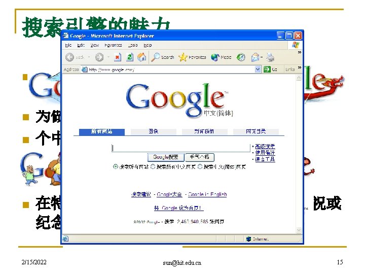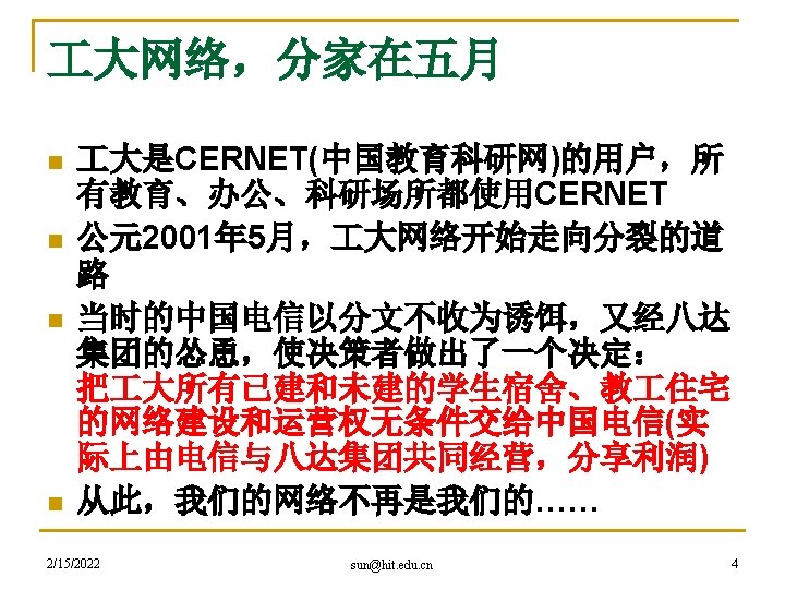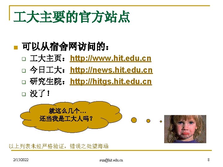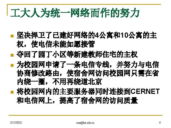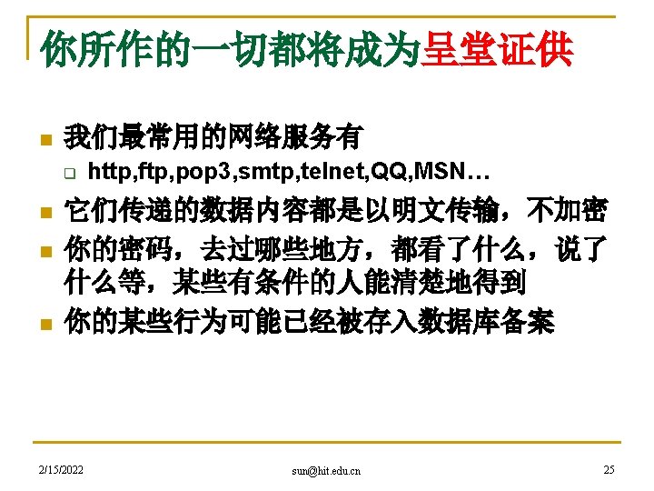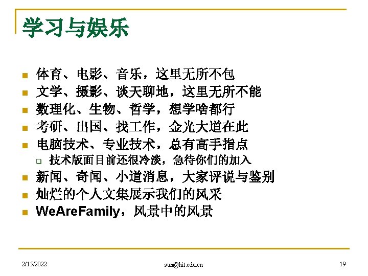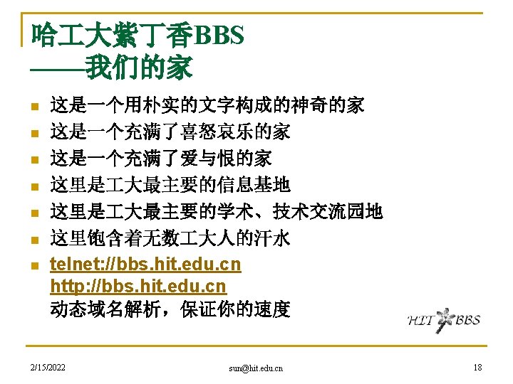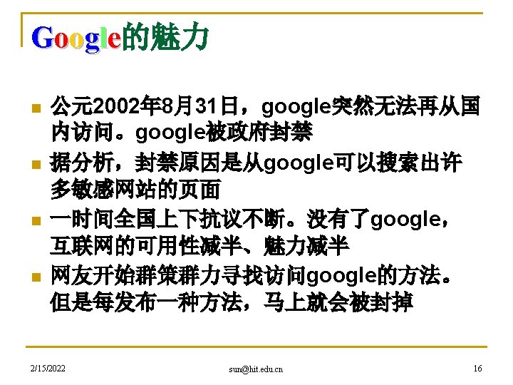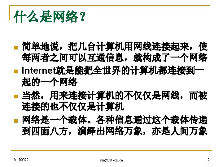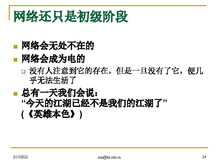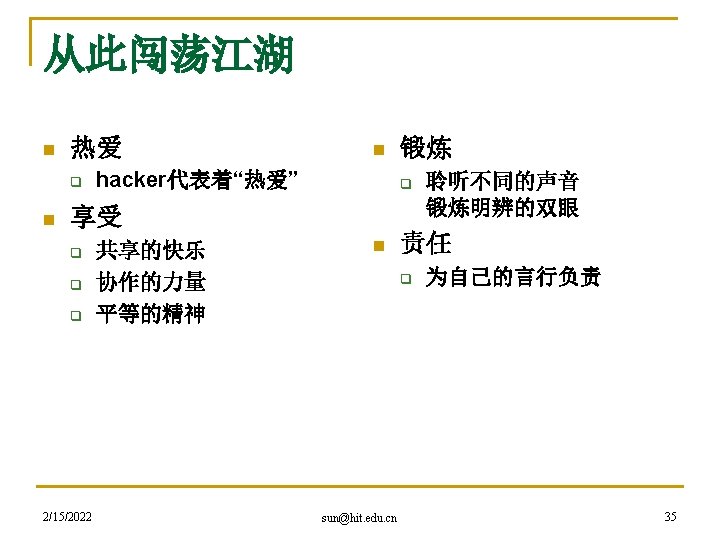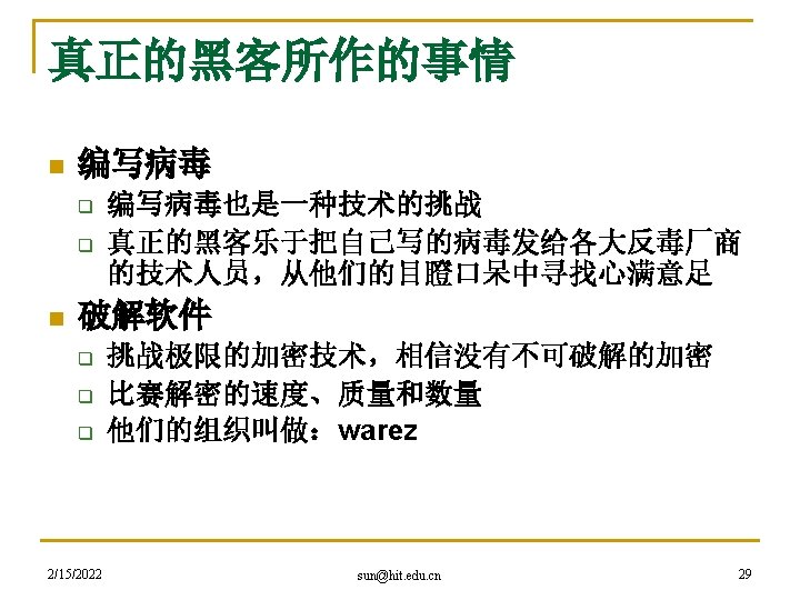 hacker精神是网络精神的代表 n 黑客本不黑 q q q 2/15/2022 An expert at programming and solving problems with a computer. -- Merriam-Webster’s Dictionary One who is proficient at using or programming a computer; a computer buff. -- American Heritage Dictionary Someone who loves to program and enjoys being clever about it. -- Richard Stallman sun@hit. edu. cn 27