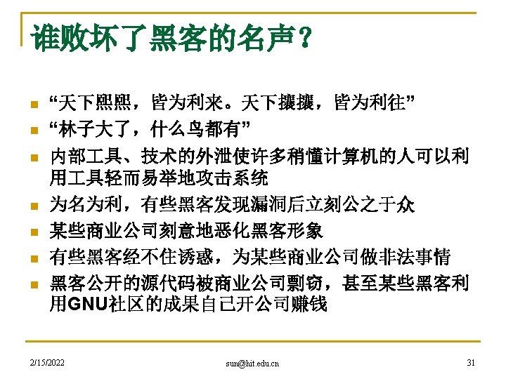 现在的hacker定义 n n A person who illegally gains access to and sometimes tampers with information in a computer system. -- Merriam-Webster’s Dictionary One who illegally gains access to or enters another's electronic system to obtain secret information or steal money. -- American Heritage Dictionary 2/15/2022 sun@hit. edu. cn 32