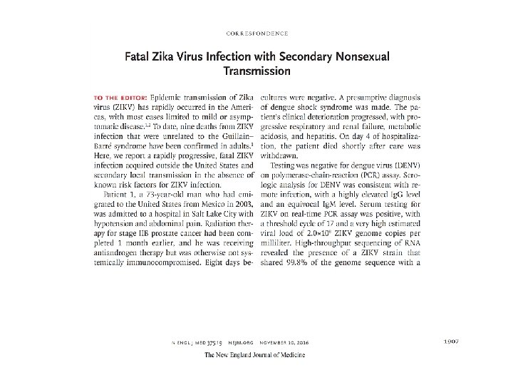 Cuadro clínico Ultimamente cuadros severos. Falla múltiple de organos y trombocitopenia. Púrpura trombocitopénica En comparación a flavirus encefalíticos (WNV, TBEV) ZIKV da menos meningitis y encefalitis. • En adultos uveitis. • Ceguera por enfermedad inflamatoria. • •