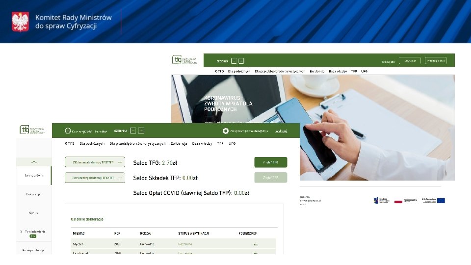 PRODUKTY PROJEKTU - Platforma Usług Turystycznego Funduszu Gwarancyjnego Nazwa produktu Planowany termin wdrożenia Faktyczny termin wdrożenia Uwagi Platforma Usług Turystycznego Funduszu Gwarancyjnego 09 -2020 Aneks nr 4 przesunął termin wdrożenia z 7 -2020 na 9 -2020. Uruchomienie pilotażowe na środowisku produkcyjnym miało miejsce w marcu 2020 U 01 – Obsługa deklaracji i płatności przedsiębiorców turystycznych 09 -2020 j. w. U 02 – Platforma komunikacji dla przedsiębiorców i obywateli 09 -2020 j. w. U 03 – Obsługa wypłaty poszkodowanemu podróżnemu zwrotu kosztów przez TFG 09 -2020 j. w. U 04 – Obsługa dyspozycji wypłaty zaliczki i rozliczeń MW 09 -2020 j. w. U 05 – Platforma komunikacji dla administracji publicznej 09 -2020 j. w. U 06 – Generowanie raportów z zakresu danych TFG 09 -2020 j. w. U 07 – Wykrywanie anomalii na rynku turystycznym 09 -2020 j. w.