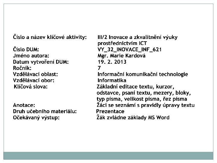 Prohlašuji, že při tvorbě tohoto výukového materiálu jsem respektovala všeobecně užívané právní a morální zvyklosti, autorská a jiná práva 3. osob, zejména práva duševního vlastnictví dle zákona č. 121/2000 Sb. (autorský zákon). Nesu veškerou právní odpovědnost za obsah a původ svého díla. Prohlašuji dále, že výše uvedený materiál jsem ověřila ve výuce a provedla o tom zápis do TK. Dávám souhlas, aby moje dílo bylo dáno k dispozici veřejnosti k účelům volného užití (§ 30, odst. 1 zákona 121/2000 Sb. ), tj. že k uvedeným účelům může být kýmkoliv zveřejňováno, používáno, upravováno a uchováváno. Datum: 19. 2. 2013 Autor: Mgr. Marie Kardová