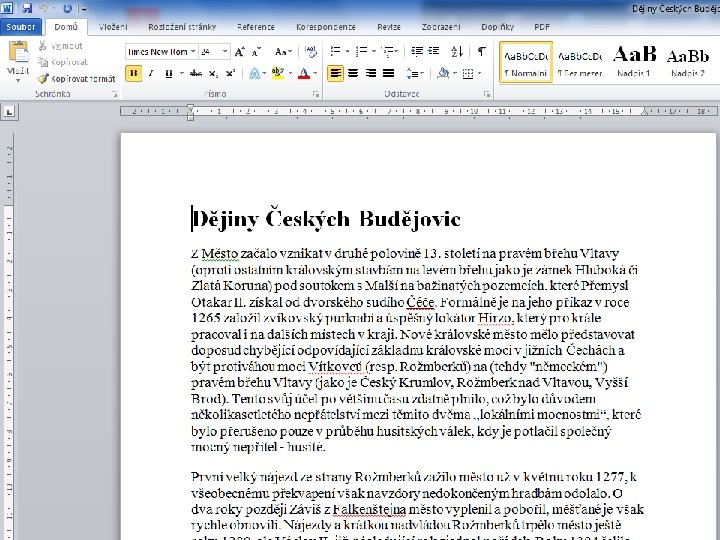 Pravidla při psaní textu �V souvislém textu neukončujeme řádek klávesou Enter – program sám zalomí řádek. �Vše, co je odděleno klávesou Enter, je pro Word nový odstavec. �Konečný vzhled dokumentu upravujeme až po napsání. �Velká písmena píšeme pomocí klávesy Shift. �Velká písmena s háčkem a čárkou píšeme nejdřív háček(čárku) a potom velké písmeno. �Mezera se vždy píše za interpunkčním znaménkem, před pomlčkou a za ní. Uvnitř závorek se mezera nepíše.