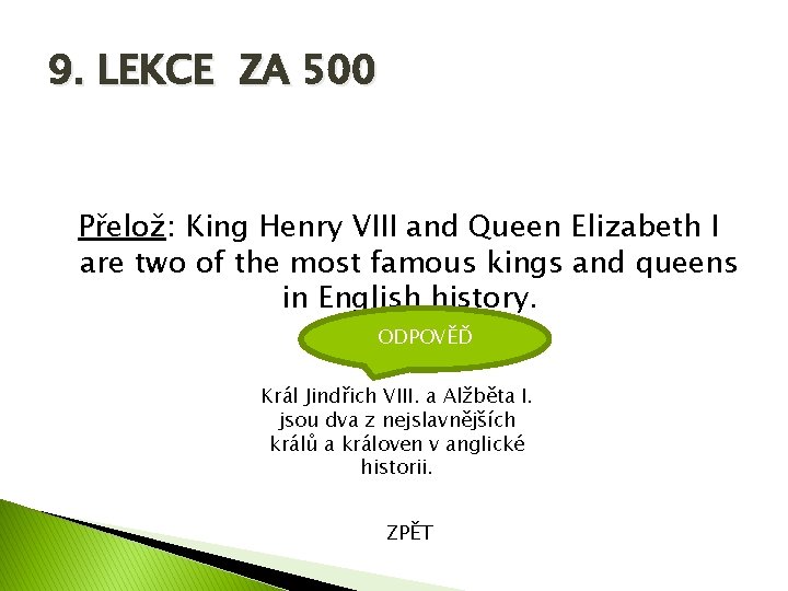 9. LEKCE ZA 500 Přelož: King Henry VIII and Queen Elizabeth I are two of the most famous kings and queens in English history. ODPOVĚĎ Král Jindřich VIII. a Alžběta I. jsou dva z nejslavnějších králů a královen v anglické historii. ZPĚT