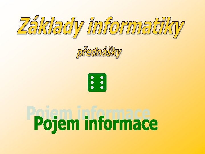 ZÁKLADY INFORMATIKY – Pojem informace 1. Vznik a vývoj teorie informace 2. Matematický aparát v teorii informace • • Základy teorie pravděpodobnosti – Náhodné veličiny Číselné soustavy 3. Informace • • 4. Kódování • • 5. Základní pojmy – jednotka a zobrazení informace, informační hodnota Entropie – vlastnosti entropie Zdroje zpráv – spojité zdroje zpráv, diskrétní zdroje zpráv Přenos informace – vlastnosti přenosu kanálů, poruchy a šumy přenosu, způsoby boje proti šumu Elementární teorie kódování Rovnoměrné kódy – telegrafní kód Nerovnoměrné kódy – Morseova abeceda, konstrukce nerovnoměrných kódů Efektivní kódy – Shannonova – Fanova metoda, Huffmanova metoda Bezpečností kódy • • • Zabezpečující schopnosti kódů, Systematické kódy, Nesystematické kódy