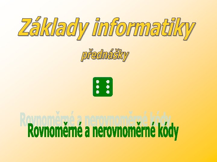 ZÁKLADY INFORMATIKY – Rovnoměrné a nerovnoměrné kódy 1. Vznik a vývoj teorie informace 2. Matematický aparát v teorii informace • • 3. Základy teorie pravděpodobnosti – Náhodné veličiny Číselné soustavy Informace • • Základní pojmy – jednotka a zobrazení informace, informační hodnota Entropie – vlastnosti entropie Zdroje zpráv – spojité zdroje zpráv, diskrétní zdroje zpráv Přenos informace – vlastnosti přenosu kanálů, poruchy a šumy přenosu, způsoby boje proti šumu 4. Kódování • • 5. Elementární teorie kódování Rovnoměrné kódy – telegrafní kód Nerovnoměrné kódy – Morseova abeceda, konstrukce nerovnoměrných kódů Efektivní kódy – Shannonova – Fanova metoda, Huffmanova metoda Bezpečností kódy • • • Zabezpečující schopnosti kódů, Systematické kódy, Nesystematické kódy
