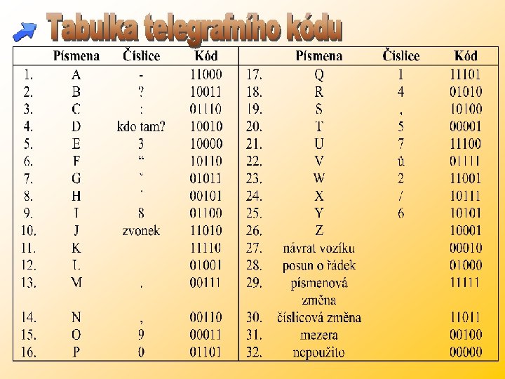O rok později už předvádí své první zařízení pro přenos signálů po drátě: na jednom konci zapíná vypínač a na druhém označuje papírovou pásku. V roce 1840 dostává MORSE patent na záznamový elektrický telegraf a telegrafní symboly. Zdrojová abeceda obsahuje • všechny písmena anglické abecedy, číslice 0, 1, . . . , 9 • a některá interpunkční znaménka. Každému znaku zdrojové abecedy je přiřazena konkrétní pětice kódových znaků 0 a 1.