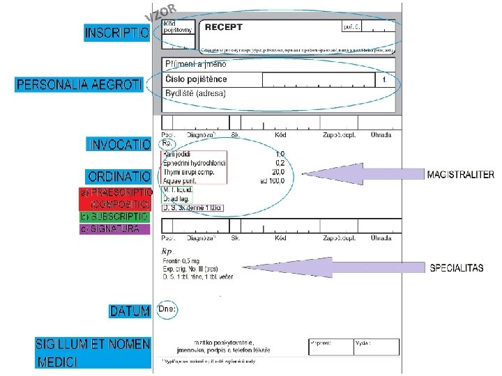 Latina ve farmakologické terminologii • Soubor termínů zavedených v Evropském lékopisu, v současnosti se užívá 8. vydání, latinsky se pojmenovávají: – léčivé a pomocné látky (acidum phosphoricum) – lékové skupiny (antipyretica, spasmolytica) – formy farmaceutických přípravků (solutio, injectio, tabuletta) – drogy (calendula officinalis) • Recepturní latina – latina je obsažena v hlavní části receptů typu „magistraliter“ /název látky a její množství/ – recept doplňuje systém ustálených zkratek určených jako pokyny lékárníkovi i pacientovi