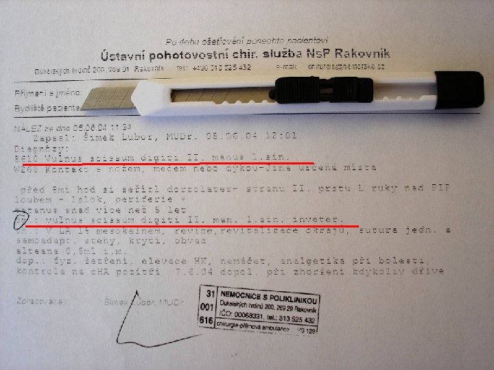 Přepis lékařské zprávy Dg. : S 610 Vulnus scissum digiti II manus l. sin W 268 Kontakt s nožem, mečem nebo dýkou Před 8 hod. si seřízl dorsolater. stranu II prstu L. ruky Th. : V LA mesokainem revisio et revitalisatio marginum, sutura, krytí a obvaz