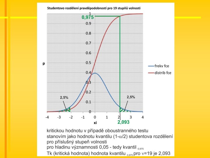 Kritickou hodnotu zjistím b) v Excelu Oboustranný test Novější verze MS Office – více typů funkce TINV § T. INV. 2 T (0. 05; 19) = 2, 093 - zadám hladinu významnosti s níž testuji a počet stupňů volnosti § T. INV (0. 975; 19) = 2, 093 – stanovím hodnotu kvantilu 0, 975 (tedy 1 -a/2) pro daný počet stupňů volnosti Starší verze MS Office –jen jeden typ funkce TINV § TINV (0. 05; 19) = 2, 093 - zadám hladinu významnosti s níž testuji a počet stupňů volnosti