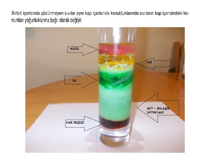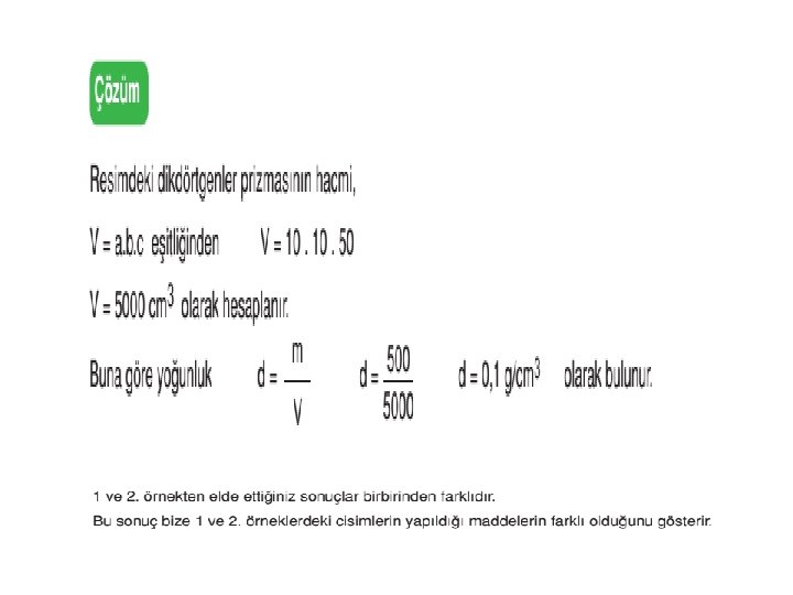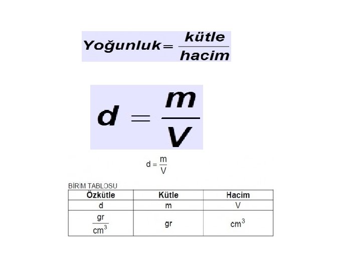 Farklı Maddelerin Yoğunlukları Maddeler Yoğunluk (g/cm 3) Su 1 Etil Alkol 0, 78 Ayçiçek Yağı 0, 92 Mum 0, 8 Çinko 7 Demir 7, 8 Bakır 8, 9 Alüminyum 2, 7 Altın 19, 3 Gümüş 10, 5 Cıva 13, 6