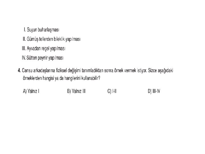 (2013 TEOG I. Dönem Sorusu) K, L, M ve N cisimlerine ait kütle ve hacim büyüklük değerleri tabloda verilmiştir. Buna göre, hangi cismin yoğunluğu (öz kütle) en büyüktür? YOĞUNLUK