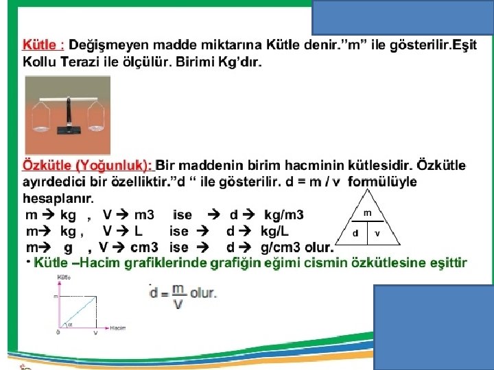 Yoğunluk nedir? **Yoğunluk bir maddenin birim hacimdeki kütlesine denir. **Maddenin ayırt edici özelliğidir, “d” sembolüyle gösterilir. Örnek: Sınıf içinde öğrenci sayısı artarsa yoğunluk artmış olur. Aynı yolda giden araç sayısı artarsa trafik yoğun deriz. Birim hacimde madde miktarı artarsa yoğunluk artar.