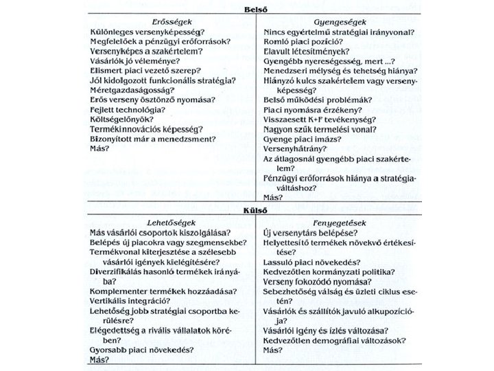 SWOT-analízis • Elemzési és gondolkodási módszert ad a sikertényezők feltérképezésére, • Strukturálja a gondolkodást • Pozícionálhatja általa a vállalkozás saját és környezeti jellemzőit • A fontos elemekre összpontosít • Rámutat arra, mit kell fejleszteni és mivel nem érdemes foglalkoznia a vállalkozásnak.