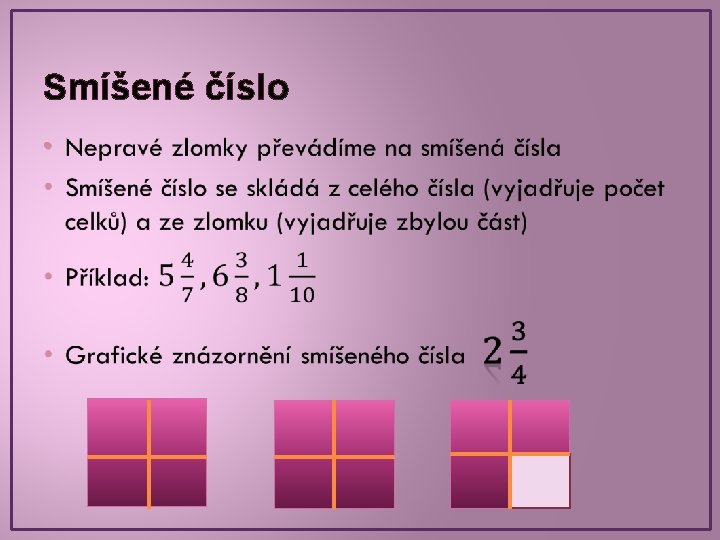 Převod smíšeného čísla na zlomek nakonec přičteme čitatele + . Čitatele výsledného zlomku určíme tak, že vynásobíme jmenovatele celým číslem. . . Jmenovatele na závěr opíšeme.
