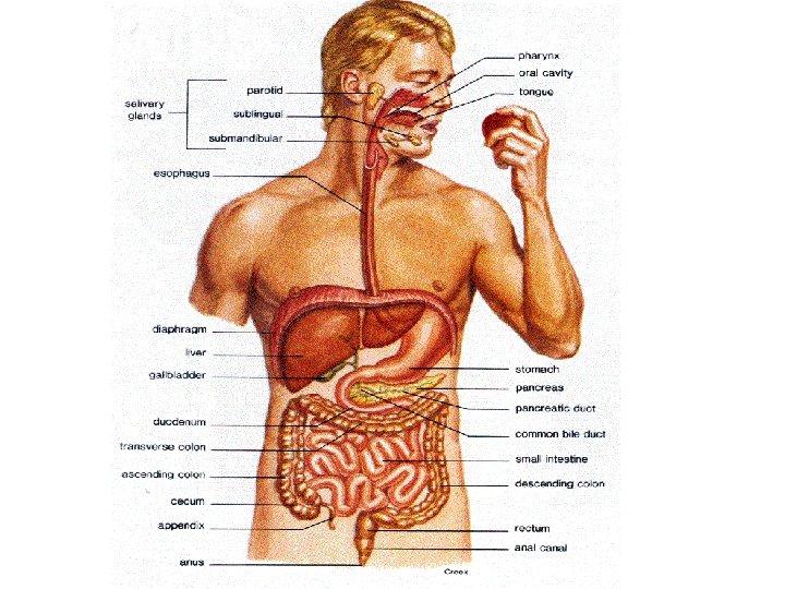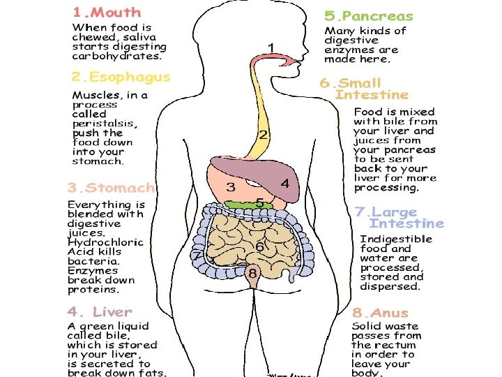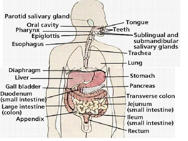 Units of the human digestive system • The human digestive system is a coiled, muscular tube (6 -9 meters long when fully extended) stretching from the mouth to the anus. • Accessory parts • Major parts – Salivary glands – Mouth – Parts of the pancreas – Pharynx – Liver – Esophagus – Gall bladder – Stomach – Small intestine – Large intestine – Anus