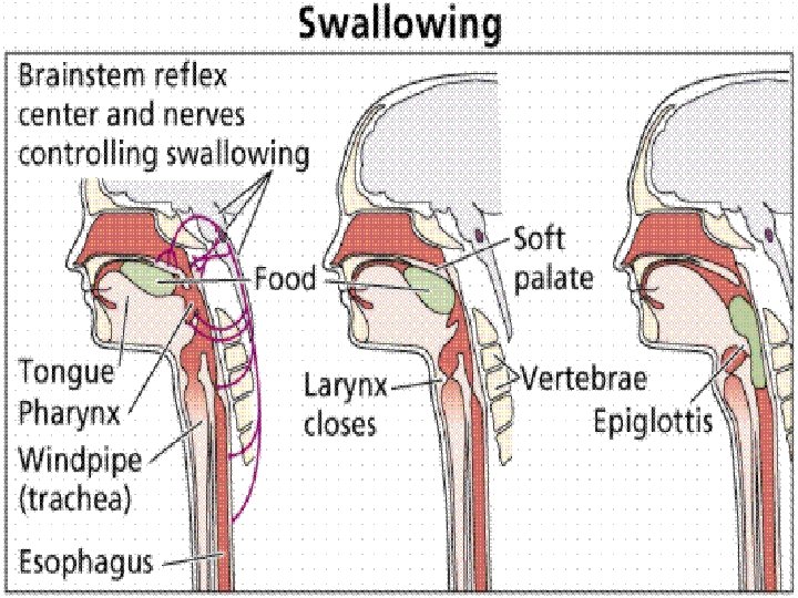 The Mouth and Pharynx • Mucus – Lubrication effect ----> moistens food • Tongue – Manipulate while chewing & swallowing – Swallowing moves food from mouth through the pharynx into the esophagus