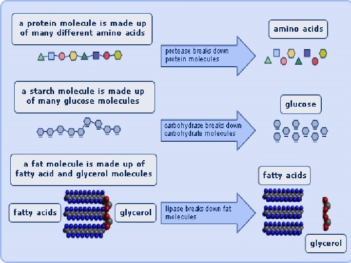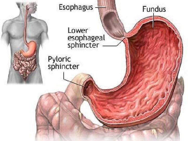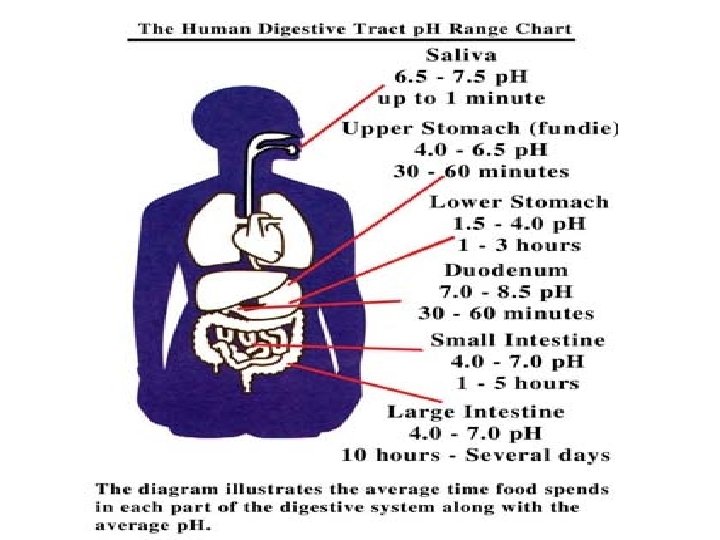 Stomach • Carbohydrate digestion continues • Hydrochloric acid – kills microorganisms – lowers the p. H to 1. 5 - 2. 5 and activates pepsin • Pepsin – proteolytic enzym – Proteins peptides • lower part of the stomach • bolus is broken down into acid chyme and allowing the stomach's acidity to inhibit further carbohydrate breakdown.
