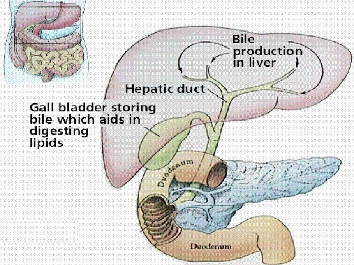Liver • produces bile, send to gall bladder via hepatic duct and store, entering the bile duct duodenum • Bile emulsifies fats, facilitating breakdown into smaller fat globules until they can be acted upon by lipase enzymes. • Bile contains cholesterol, phospholipids, bilirubin, and a mix of salts. • Fats are completely digested in the small intestine.