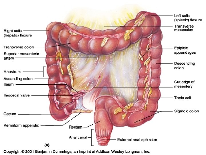 Large Intestine • Four parts – colon, cecum, appendix, and rectum. • 5 feet long. • The large intestine performs three basic functions 1. recovery of water 2. formation and storage of feces 3. microbial fermentation • Material in the large intestine is mostly indigestible residue and liquid.