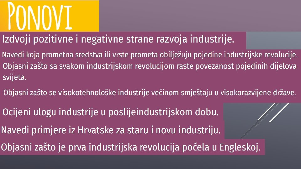 POJAVA I RAZVOJ INDUSTRIJE dominantne industrije: prva etapa tekstilna industrija 1830. godina druga etapa metalurgija Gdje se primjenjuju stvoreni proizvodi?