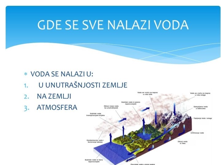 �Voda se u prirodi nalazi u sva tri agregatna stanja: �čvrstom (glečeri, lednjaci, sneg. . . ) �tečnom (mora, reke, jezera, kiša. . . ) �gasovitom (vodena para u atmosferi)