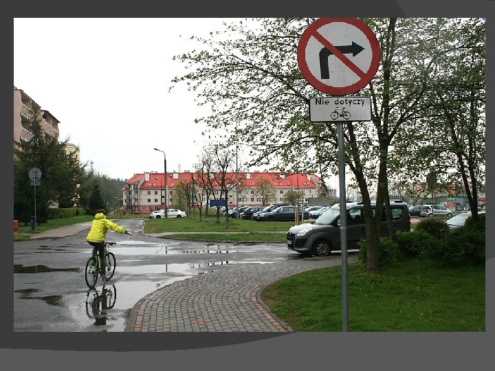 ZNAKI I SYGNAŁY DROGOWE Rowerzystę jako uczestnika ruchu drogowego obowiązują przepisy kodeksu drogowego. Należy przyporządkować się sygnałom i znakom drogowym. Sygnały świetlne są ważniejsze od znaków drogowych.