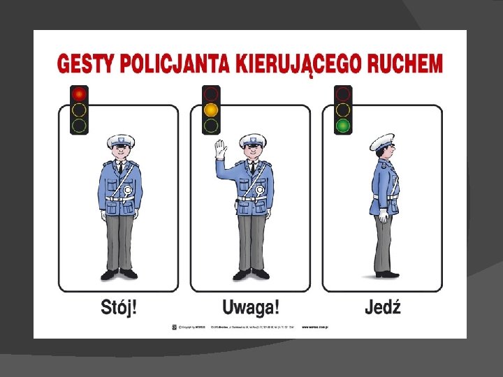 KIEROWANIE RUCHEM PRZEZ POLICJANTA Jeżeli ruchem na skrzyżowaniu kieruje policjant, to jego znaki są najważniejsze, nawet gdy działa sygnalizacja świetlna. Dopiero gdy policjant przestanie kierować ruchem pieszych i pojazdów, można stosować się do wskazań sygnalizatora.