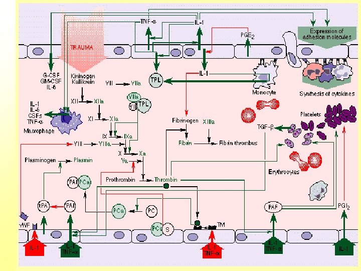 Mediátory celulárního influxu Funkce: à Chemotaxiny à Celulární aktivátory a inducery všech typů efektorových buněk à Zvýšení permeability cév à Vasodilatační a bronchokonstrikční aktivita à Zvýšená produkce hlenu àKaskády zánětlivých reakcí indukované mediátory jsou striktně řízeny. Pokud tato regulace selže, dochází až k mnohonásobnému orgánovému selhání (DIC, septický šok).