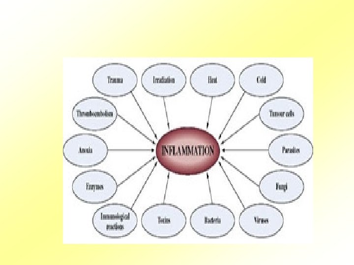 Etiologie • Fyzikální, chemické a biologické příčiny. • Zánětlivá odpověď se skládá ze změn prokrvení, zvýšené permeability cév s následnou emigrací buněk z krve do intersticia. • Tyto změny jsou relativně konstantní nezávisle na příčině a místě vzniku zánětu.