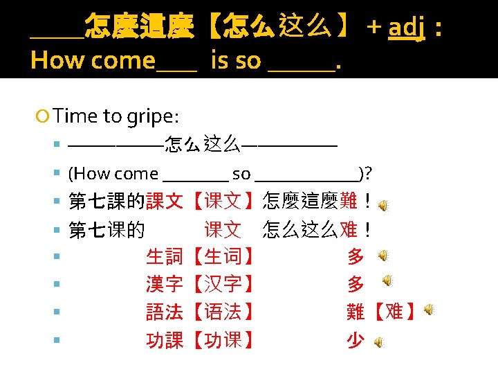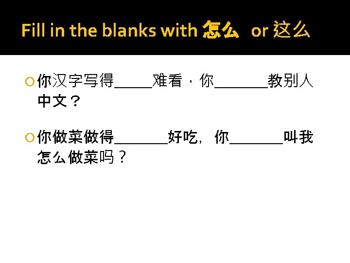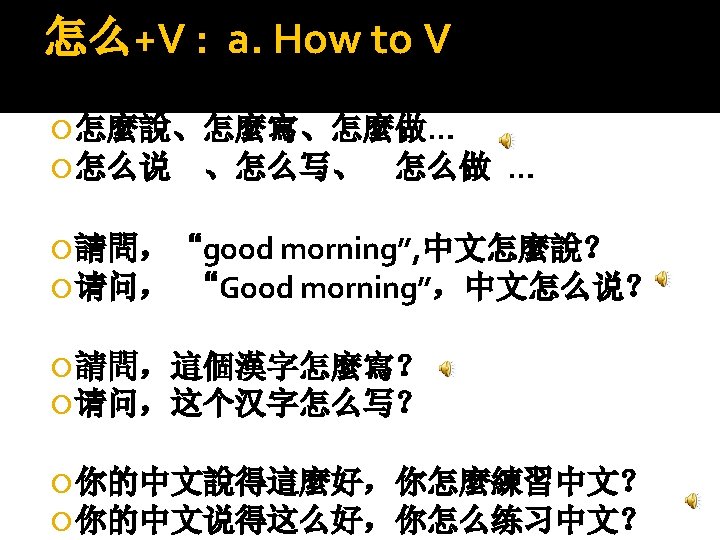 怎么a. How to V b. How come!? Why?你怎麼 1 st meaning: 怎麼+V: How to write my Chinese name? V 怎麼寫我的中文名字? 2 nd meaning: 怎麼 How come? Why? How come you did not come yesterday? 你昨天怎麼沒(有)來?