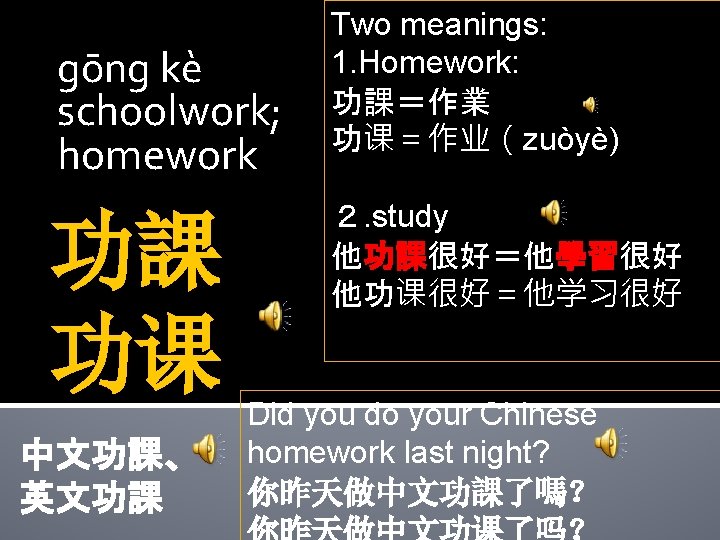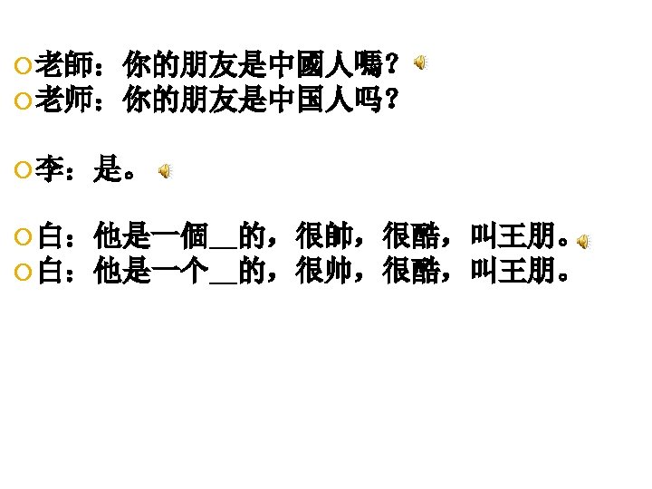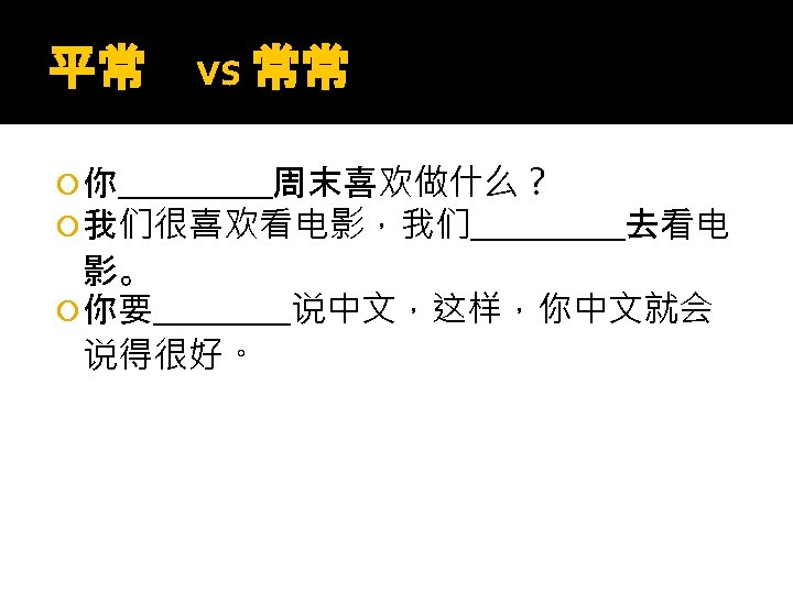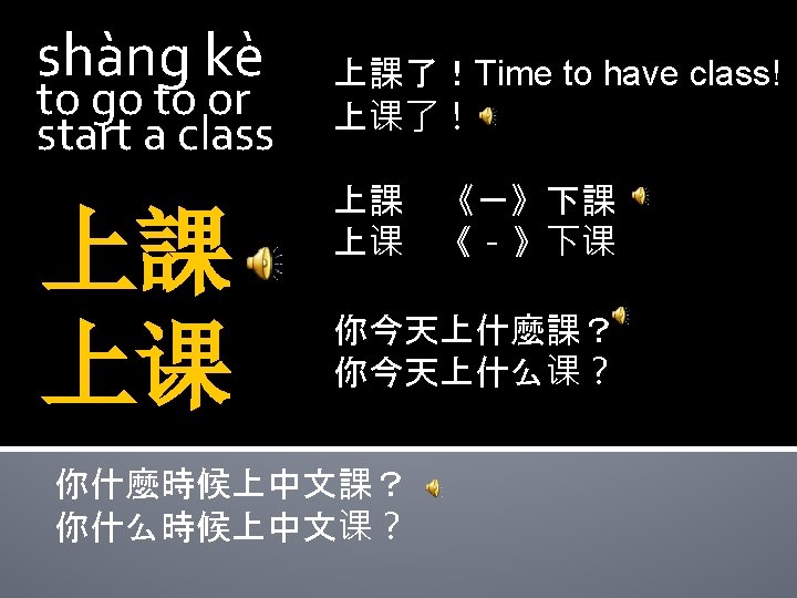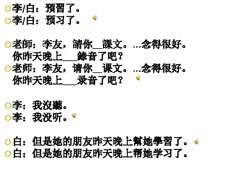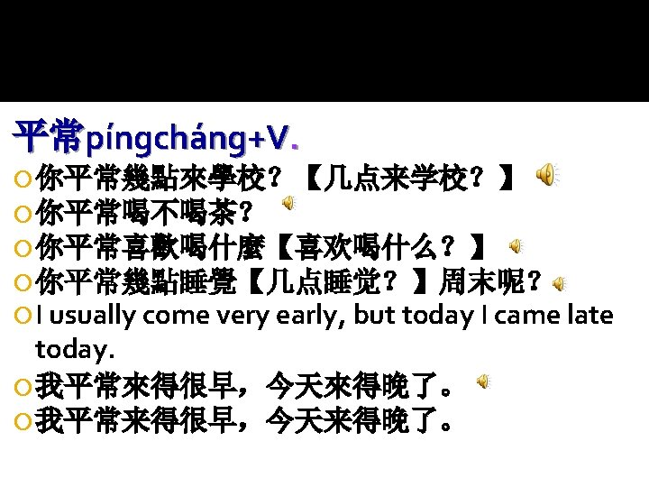 II speaking Exercise part B on workbook p. 119 Ask your classmate the following: 1. Are you late (or early) for class today? 你今天來得晚(早)嗎? 你今天来得晚(早)吗? 2. Did you go to bed early (or late) last night? 你昨天睡得早嗎? 你昨天晚上睡得早吗? 3. Did you prepare for today’s lesson? 今天的課你準備了嗎? 今天的课你准备了吗?
