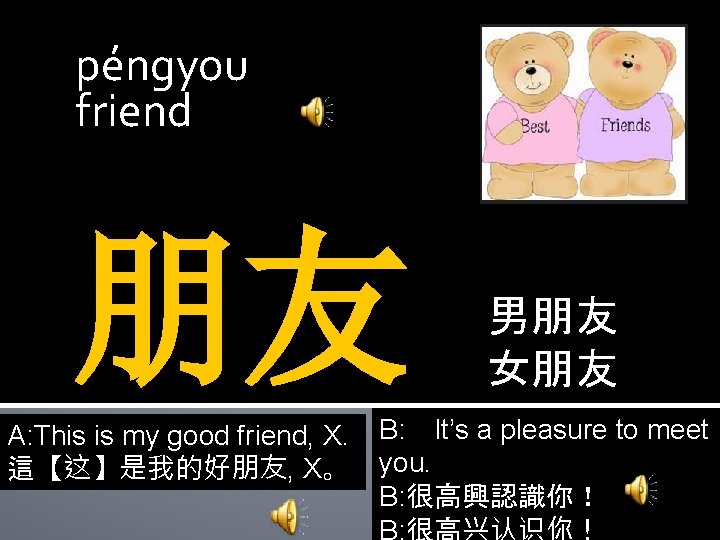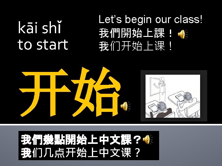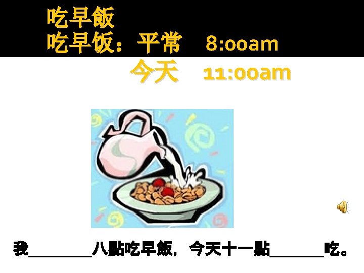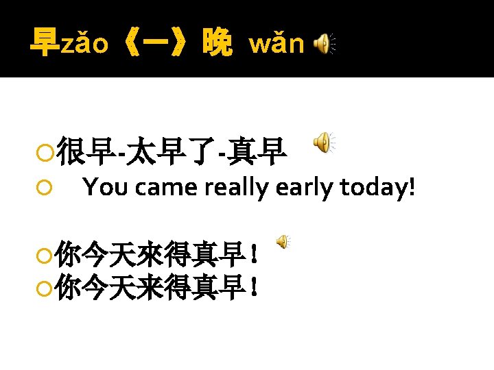 zǎo early 早 早早上 vs. 上午 • 早上 zǎoshàng early morning • 上午 shàngwǔ--》later part of morning 早!(most common greeting for “good morning!) 早安!&早上好!--》more formal and less common greeting for “good morning” Translate the times using the right word: 8 a. m. ; 10 am; 4 pm; 7 pm 早上八点; 上午十点; 下午4点; 晚上七点