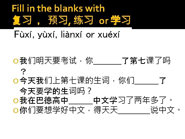 1. 明天有考試【试】, 2. how come /why how come/ why not didn’t you do your review? homework? 3. 我們 8: 00才上課 【我们 8: 00才上课】, why did you come at 7: 00 ? 4. 昨天是小高的生日, why did his girlfriend not come? 5. 今天的小考很容易, 6. 今天星期二, how come you did so come you didn’t go to poorly in your test? the Chinese class?
