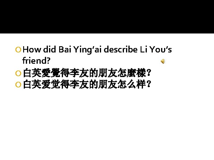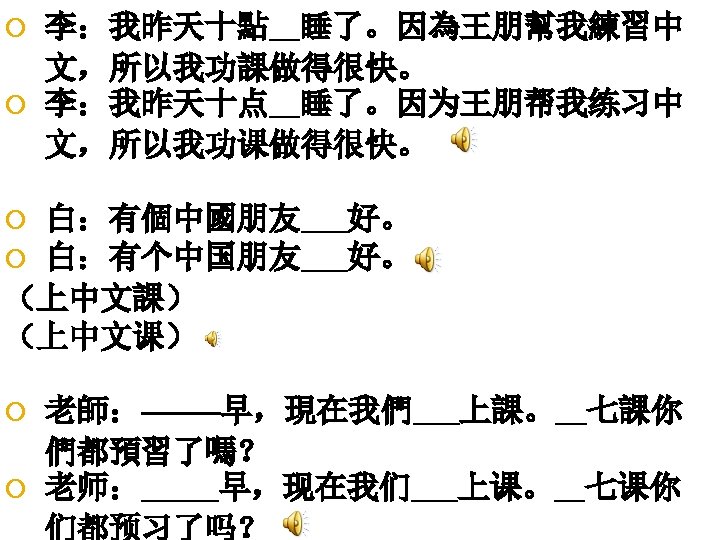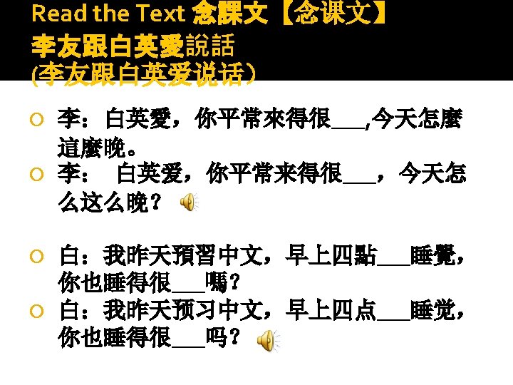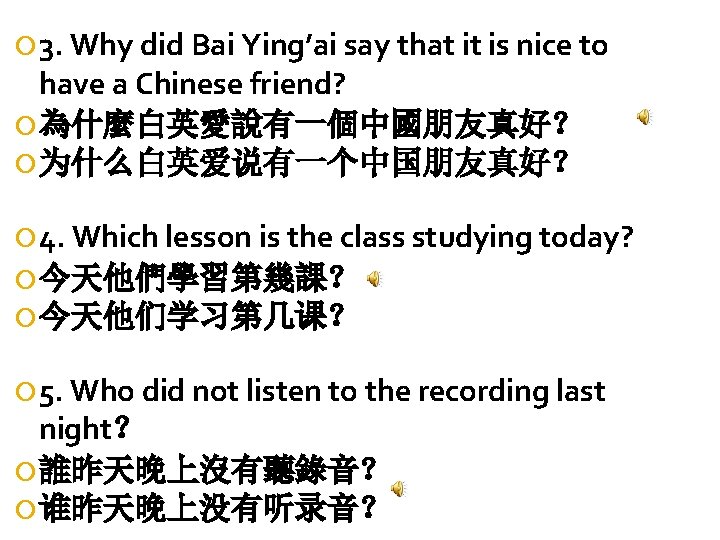 Speaking Exercises Workbook on p. 119, II. A. 1. Why did Bai Ying’ai come so late today? 為什麼白英愛今天來得這麼晚? 为什么白英爱今天来得这么晚? 2. Why was Li You able to go to bed early last night? 為什麼李友昨天晚上睡得早? 为什么李友昨天晚上睡得早?