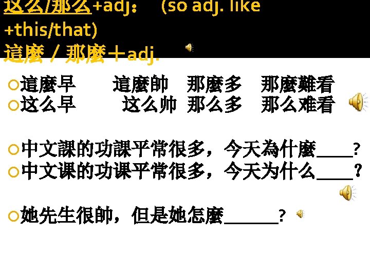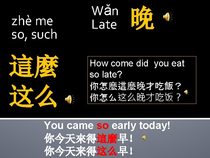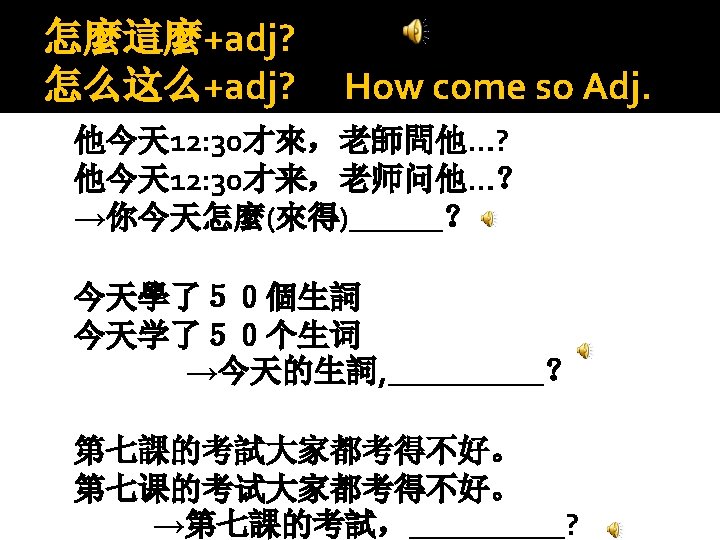 怎么+V : b. How; How come?In Questions It is often used to ask about the reason or the cause of an action. It is usually used for a special reason. 平常: 12: 00 来学校;今天 10: 30来。 —>你今天_____来得这么___? 平常:做功课; 今天没做功课 —>你今天_____没做功课?