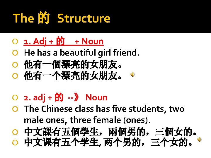 Descriptive Complement: S+(V)+ O +V 得+很/不+Adj Q 1: When do you use得? describe how an action is done—for example, how well/fast it is done. Q 2: Can you use “了” with 得? No Make sentence 他/平常/說話/很快 他/ 平常/ 說話/ 很快。 他/上個星期/考試/很好。 他/ 上个星期/ 考试/ 很好。