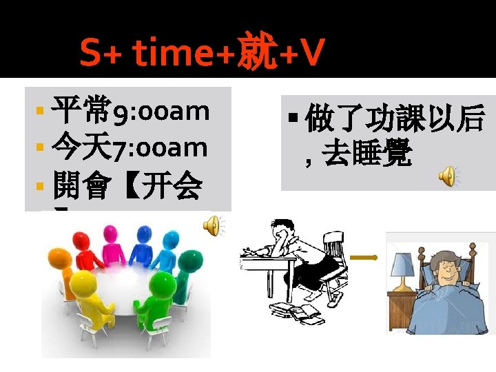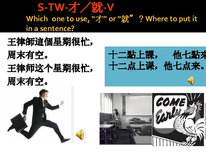 Adv. 就 and 才+VERB Q 1: What is 就+V? sooner or earlier than usual or expected Q 2: What is 才+V? later than expected Please insert “就””才”into the sentences: 我昨天晚上九点___睡觉。他半夜(bànyè)两点 __睡觉。 Q: 老师您上午有空吗? A:我下午四点以后____有空。