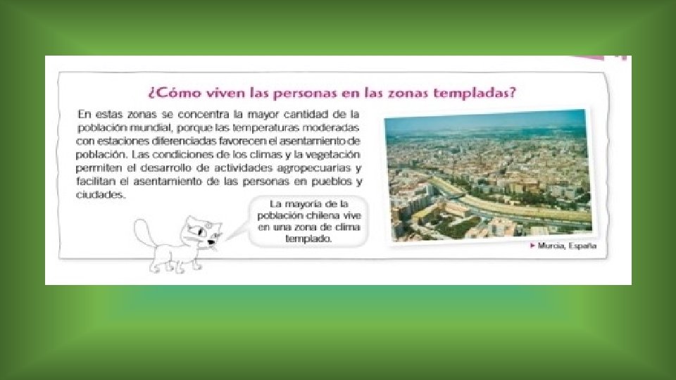 • En cada zona climática podemos encontrar distintos tipos de climas. Esto se explica por la influencia de factores como la circulación de los vientos, la altura de un lugar o la distancia a la que esté del mar. Desarrolla la pagina 47 del texto del estudiante.